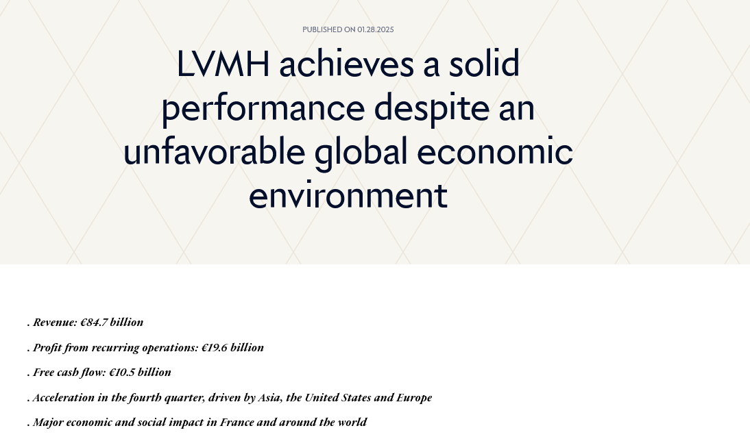 Der weltgrößte Luxuskonzern LVMH Moët Hennessy Louis Vuitton meldet für das Jahr 2024 ein Umsatzplus von 1 Prozent auf 84,7 Milliarden Euro und übertrifft damit die Markterwartungen.