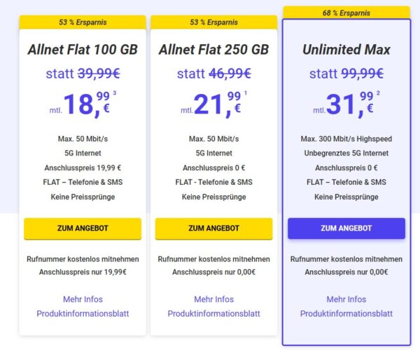 - MegaSIM 250 GB 5G Allnet Flat-Tarif für 23,99€/Monat