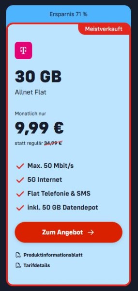 - mobilfunk.de: 30GB Allnet-Flat mit 50GB Datendepot für monatlich 9,99€ im Telekom-Netz