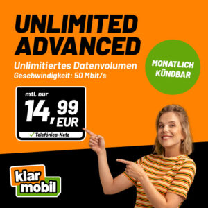 Stark bei klarmobil bekommt ihr als Black Week Deal die Unlimited 5G + Allnet-Flat im o2-Netz für 14,99€/Monat