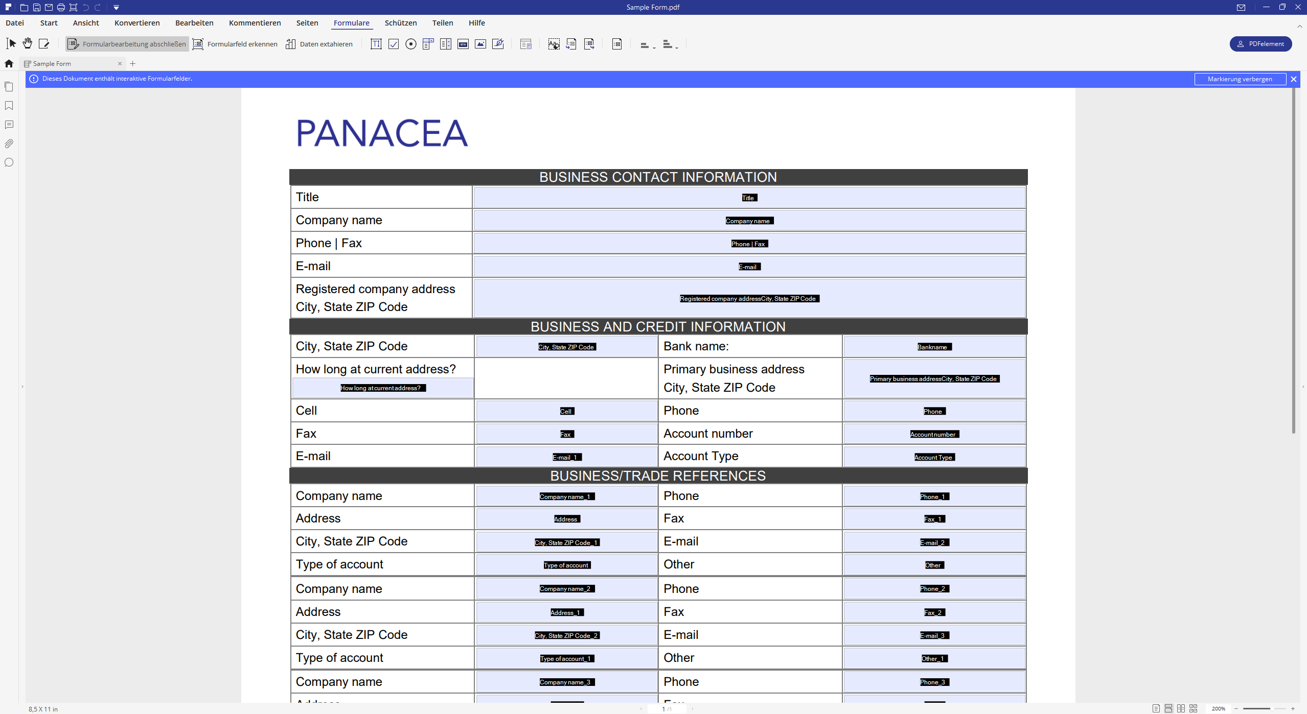 Um ein ausfüllbares PDF Dokument zu erstellen, stehen Ihnen zunächst einmal mehrere Möglichkeiten zur Verfügung. Sie können das PDF Formular manuell oder als interaktives Formular aus einer Word- oder Excel-Tabelle erstellen. Zusätzlich haben Sie die Möglichkeit, ein nicht ausfüllbares PDF Formular zu einem ausfüllbaren zu konvertieren. Wenn Sie über einen dieser Wege ein ausfüllbares PDF Dokument mit PDFelement erstellt haben, stehen Ihnen unter Formulare verschiedene Funktionen für Ihr Dokument zur Verfügung. Sie können Ihrem Dokument Textfelder, Kontrollkästchen, Optionsfelder, Listen, Bilder, Schaltflächen und digitale Signaturen hinzufügen. Zusätzlich haben Sie die Möglichkeit, Daten aus Formularfeldern zu löschen, zu importieren und zu exportieren.