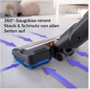 - Der Philips SpeedPro Max Akku-Staubsauger sorgt ohne viel Mühe für ein sauberes Zuhause bis in die tiefsten Ecken. Die 360°-Saugdüse erfasst von allen Seiten Staub und garantiert damit eine gründliche Reinigung. Der Schmutzbehälter ist oberhalb des Geräts montiert – für eine Reichweite auch unter flachen Möbeln. Und die LED-Beleuchtung an der Düse zeigt versteckten Staub an, damit alle Bereiche zuverlässig gereinigt werden. Dank der digitalen Anzeige haben Sie die Akkulaufzeit, die Geschwindigkeitsstufen und den Zeitpunkt der Filterreinigung immer im Blick.