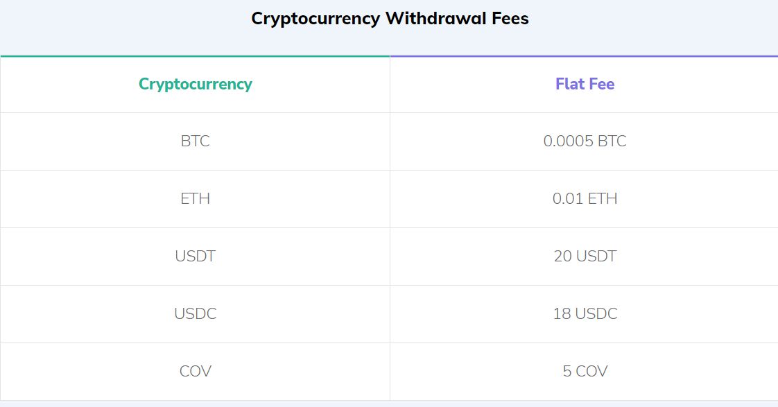 Prime XBT unterstützt keine Auszahlungen von Fiat-Währungen. Für Abhebungen von Kryptowährungen fällt je nach Coin eine Pauschalgebühr an, wie in der Tabelle unten dargestellt.