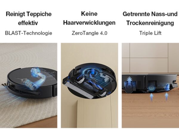 Die Kombination aus AIVI 3D 4.0 und TruePass Adaptive 4WD macht die Navigation extrem zuverlässig. Der Roboter überwindet Schwellen bis 2,4 cm (einzeln) bzw. 4 cm (mehrere hintereinander), weicht Hindernissen wie Kabeln, Stuhlbeinen und Spielzeug souverän aus und navigiert präzise durch enge Räume. In meinem Alltag mit vielen herumliegenden Gegenständen hat er sich nie festgefahren – ein großer Vorteil gegenüber älteren Robotern. Dank PowerBoost-Aufladen reichen schon 3 Minuten Ladezeit für 10 % Akkukapazität. Mit einer Laufzeit von bis zu 350 Minuten schafft er bis zu 500 m² ohne Unterbrechung. Perfekt für große Wohnungen oder Häuser.