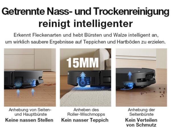 Für mich persönlich ist die Wischleistung der größte Gamechanger. Statt der üblichen rotierenden Pads setzt Ecovacs hier auf den OZMO ROLLER 3.0 – eine 27 cm lange Mikrofaser-Walze, die mit bis zu 200 U/min rotiert und kontinuierlich mit frischem Wasser gespült wird. 32 Hochdruckstrahlen und eine luftdruckbetriebene Pumpe lösen selbst hartnäckige Flecken wie Soßenreste, Fußabdrücke oder leichte Verschmutzungen zuverlässig. Die TruEdge 3.0-Technologie lässt die Walze bis zu 1,5 cm an die Kante heranfahren, sodass endlich keine unschönen Randstreifen mehr zurückbleiben. Das Triple Lift System hebt die Walze bei Bedarf bis zu 15 mm an, damit Teppiche trocken bleiben. Erkennt der Roboter hartnäckige Flecken, aktiviert er automatisch den AI Instant-Remop 2.0 und fährt gezielte Kreuzmuster. Nach dem Kochen in der Küche oder nach einem langen Tag mit vielen Schuhabdrücken war der Boden jedes Mal spiegelblank und streifenfrei. Die Walze wird in der OMNI-Station bei 75 °C mit Heißwasser gewaschen und anschließend heiß getrocknet. Dadurch entsteht kein unangenehmer Geruch und die Hygiene bleibt auf höchstem Niveau – ideal für Haushalte mit Haustieren oder kleinen Kindern.