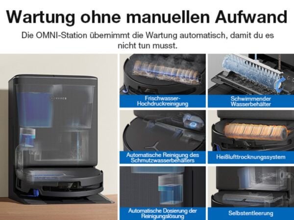 Die OMNI-Station ist der eigentliche Star des Systems. Sie entleert den 2,5-Liter-Staubbehälter des Roboters vollautomatisch und ermöglicht bis zu 90 Tage wartungsfreien Betrieb. Die Walze wird mit Hochdruck und 75 °C heißem Wasser gewaschen, anschließend mit Heißluft getrocknet (2–4 Stunden) und der Schmutzwassertank wird sogar selbst gereinigt – dank eines 5.000 U/min-Propellers. Der 4-Liter-Frischwassertank reicht für bis zu 400 m² Wischfläche. Ich muss lediglich alle zwei bis drei Monate den Staubbeutel wechseln und Wasser nachfüllen. Kein lästiges Auswaschen des Mopps, kein manuelles Entleeren des Staubbehälters – pure Bequemlichkeit. Die Station ist dabei kompakt, leise und hygienisch (antibakterielle Beutel). Die automatische Dosierung der Reinigungslösung sorgt zusätzlich für einen frischen, sauberen Duft im ganzen Haus.