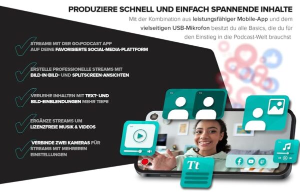 - Mit der Kombination aus leistungsfähiger App und vielseitigem USB-Mikrofon kannst du schnell und einfach hochwertige Streams erzeugen – auch als Einsteiger.