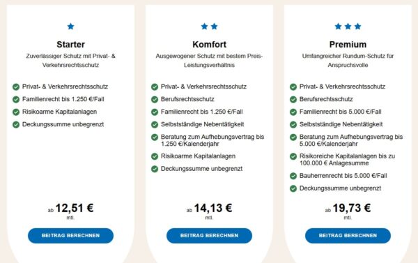 ROLAND macht es euch einfach und teilt den Schutz in drei logische Stufen ein. Der Starter-Tarif für schmale 12,51€ mtl. deckt bereits das Wichtigste ab: Privat- und Verkehrsrechtsschutz. Wer auch im Job abgesichert sein will (Thema Abmahnung oder Zeugnisstreit), sollte zum Komfort-Tarif greifen.