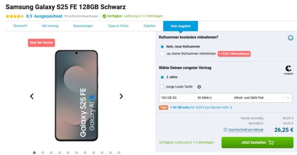 Neuer Deal seitens Gomibo, dort bekommt ihr das Samsung Galaxy S25 FE (128GB) + 100GB 5G + Alles-Flat im Telekom-Netz für 24€/Monat