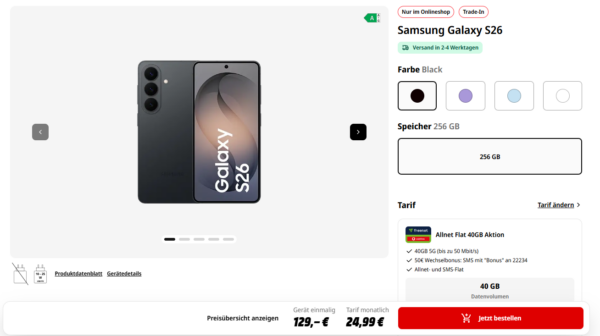 Bei MediaMarkt bekommt ihr gerade das brandneue Samsung Galaxy S26 zum Schleuderpreis im Vodafone-Netz.