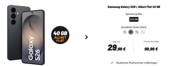 Wer gerade ein neues Samsung-Flaggschiff mit viel Speicher sucht, sollte sich dieses Bundle anschauen: Über klarmobil bekommt ihr eine Vodafone Allnet-Flat mit 40GB 5G für 29,99€/Monat und dazu das Samsung Galaxy S26 (512GB) für einmalig 99,99€. Die Anschlussgebühr beträgt 0€ - ihr zahlt also keinen Anschlusspreis.