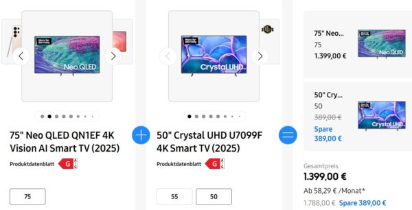 Richtig krasser Deal seitens Samsung, dort ist nun die Swipe & Match Aktion gestartet, dort bekommt ihr z.B. 75″ 4K TV GQ-QN1EF mit Vision AI für 1399€ + on top: 55″ 4K TV U7099F im Wert von 400€