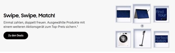 Die Samsung Swipe & Match Aktion ist eine attraktive Verkaufsförderungskampagne von Samsung, bei der Kundinnen und Kunden durch das „Swipen“ auf einer speziellen Aktionsseite passende Produkt-Kombinationen entdecken und dabei attraktive Prämien oder Rabatte erhalten können. Im Mittelpunkt steht dabei das gezielte Kombinieren von Samsung-Produkten – beispielsweise Smartphones mit Wearables, Tablets oder Zubehör – um exklusive Bundles freizuschalten.
