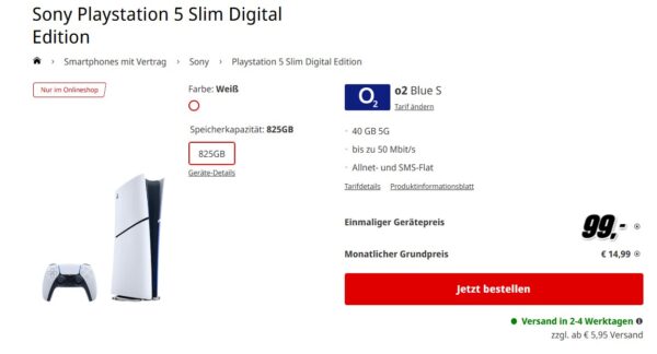 Sony PlayStation 5 Slim Digital Edition + 40GB 5G + Alles-Flat im o2-Netz für 14,99€/Monat – eff. 6,49€/Monat