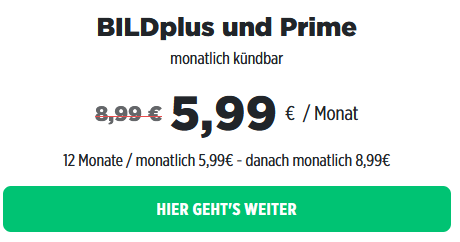 Ihr erhaltet nämlich BILDplus und Amazon Prime für 5,99€/Monat statt 8,99€/Monat, der Preis ist 12 Monate lang rabattiert. Gekündigt werden kann monatlich.