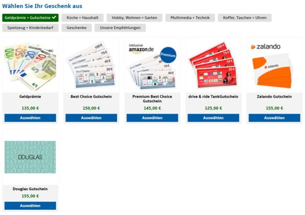 Diese Prämien stehen zum Beispiel zur Auswahl: