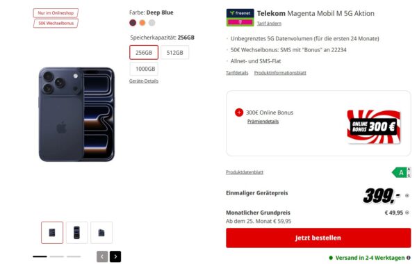 Stark! MediaMarkt läutet das Wochenende mit einem guten Tarif ein, das Apple iPhone 17 Pro + Unbegrenztes 5G + Alles-Flat im Telekom-Netz für 49,95€/Monat.