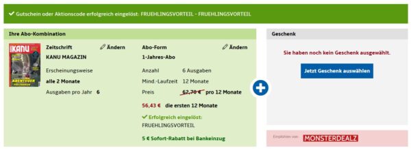 Bei Hobby + Freizeit gibt es das KANU MAGAZIN Jahresabo für 51,43€ + bis zu 50€ Prämie.