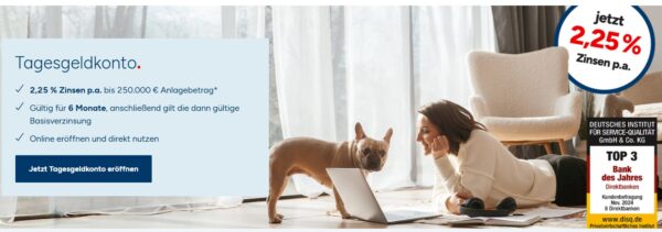 Ihr möchtet euer Geld gerne auf einem Tagesgeldkonto anlegen, bei der 1822direkt bekommt ihr 2,25% Zinsen p.a. für 6 Monate.