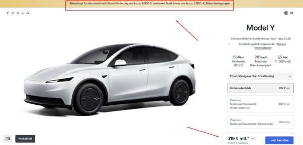 Bei Tesla bekommt ihr gerade das Tesla Model Y (Hinterradantrieb) effektiv ab 350 € mtl. (inkl. 3.000€ Tesla-Bonus) Zusätzlich bis zu 6.000€ Förderung möglich!