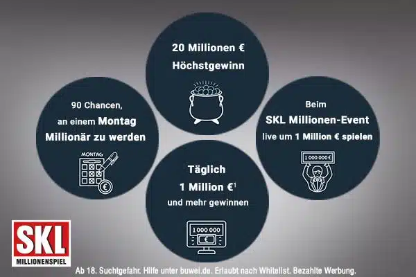 In der 159. SKL warten insgesamt 265 Millionengewinne auf euch. Besonders lukrativ sind die Montage: Hier gibt es gleich 85 Chancen, über Nacht zum Millionär zu werden. Da verliert der „Monday Blues“ doch direkt seinen Schrecken, oder?