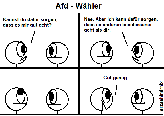 Je mehr Leuten es schlecht geht, desto besser für die AFD. Dass die AFD an der Macht die Misere nur vergrößern würde, so weit denkt halt keiner dieser Protestwähler. Dabei ist Demokratie eigentlich zu schade, um wichtige Zeit mit solchen infantilen Spielchen zu verschwenden.