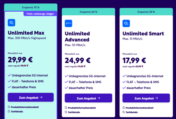 Im o2-Netz erhaltet ihr die folgenden Unlimited-Tarife mit oder ohne Laufzeit.