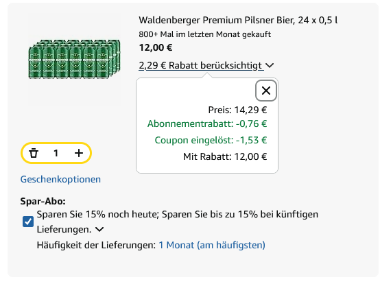Dank Bestellung per Amazon Spar-Abo gibt es Waldenberger Premium Pilsner Bier 24 x 0,5 l ab effektiv 12€. (regulärer Preis: ~16€) Ersparnis: ~4€