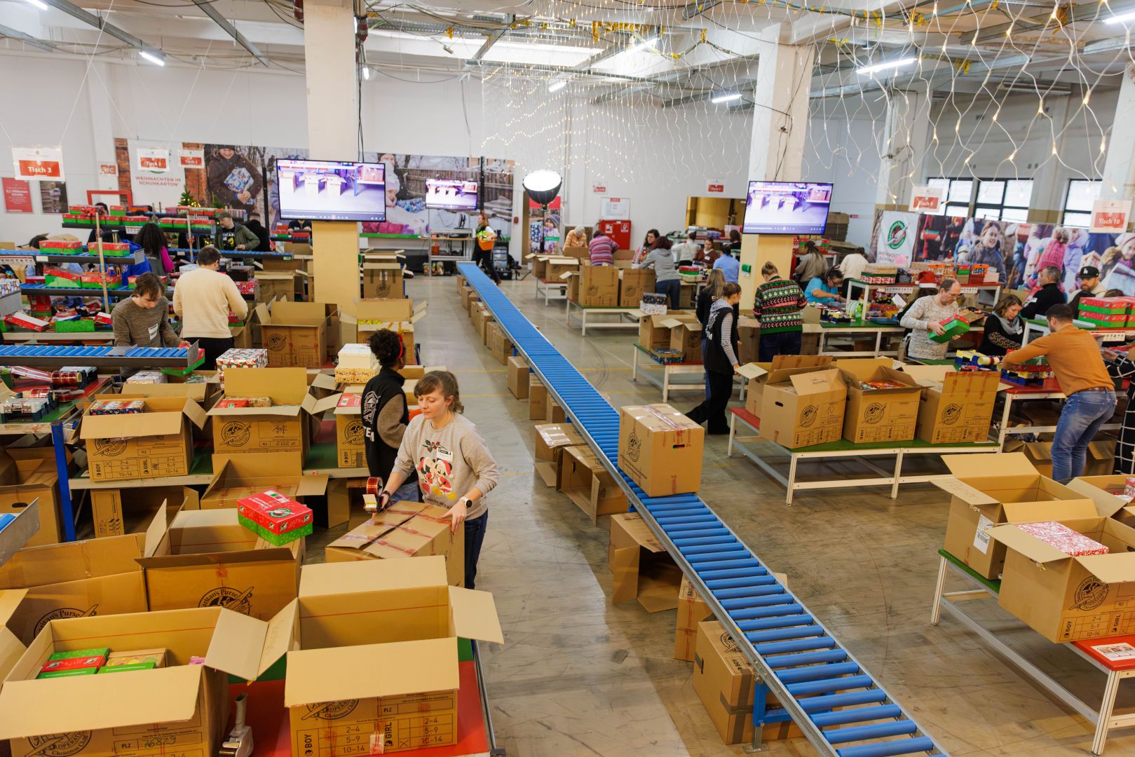 Die Berliner Weihnachtswerkstatt funktioniert wie eine Produktionsstraße: An zwölf Stationen schauen die Ehrenamtlichen in insgesamt 47 Schichten jeden einzelnen Karton durch. So wird sichergestellt, dass Einfuhrbestimmungen und Packvorschriften eingehalten werden und nur für die jeweilige Altersgruppe geeignete Geschenke in Kinderhände gelangen. Danach machen sich die Kartons auf eine oft abenteuerliche Reise – gelegentlich übernehmen Kamele, Esel, Boote oder Schlitten die letzten Etappen. Im vergangenen Jahr wurden fast 300.000 Pakete aus dem deutschsprachigen Raum verschickt, sie gingen überwiegend nach Osteuropa. Alle, die mitverfolgen wollen, wie in den Weihnachtswerkstätten gearbeitet wird, können dies über denLive-Tickertun!