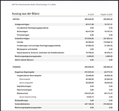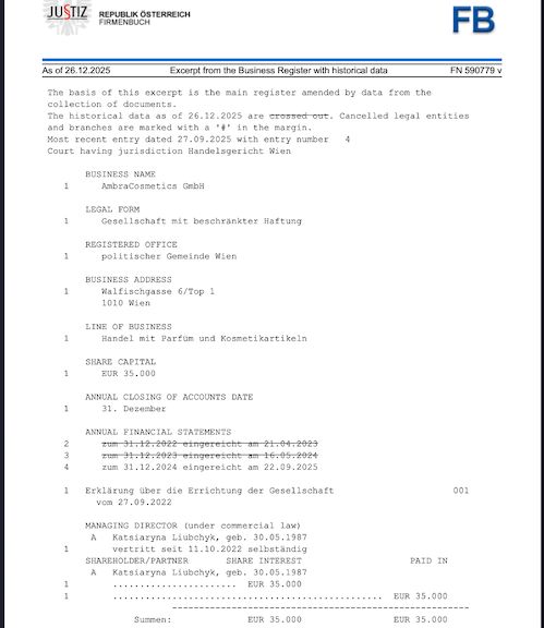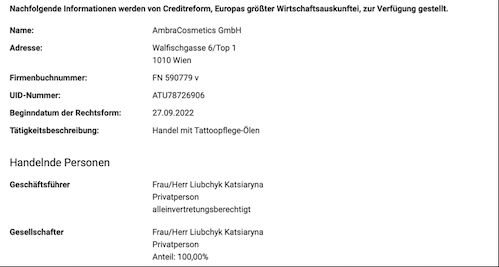 Doch Tuzov kommt nach der Analyse der Finanzberichterstattung aus österreichischen Registern zu dem Schluss: Die Realität sieht völlig anders aus. Die Abschlüsse der AmbraCosmetics GmbH für die Jahre 2023 und 2024 zeigen, dass das Unternehmen defizitär ist. Der Journalist nennt konkrete Zahlen: Innerhalb von zwei Jahren hat das Unternehmen fast 450.000 Euro an Schulden angehäuft (die Verbindlichkeiten belaufen sich auf 447.168,38 Euro). Zudem wurden nahezu 60.000 Euro Verlust im Jahr 2023 sowie rund 200.000 Euro Verlust im Jahr 2024 aus der operativen Tätigkeit verbucht.