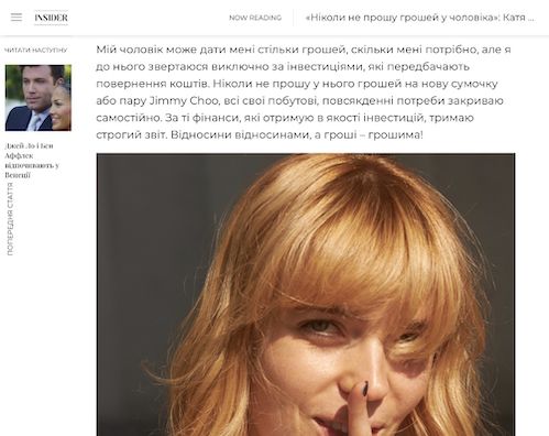 Tuzov zitiert zudem Kateryna Liubchyk selbst aus einem Interview mit „Insider“, in dem sie einräumt: „Mein Mann kann mir so viel Geld geben, wie ich brauche, aber ich wende mich an ihn ausschließlich für Investitionen.“