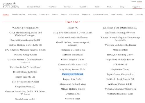 Ein weiterer Aspekt der Recherche ist der Versuch, Status zu kaufen. Tuzov stellte fest, dass Kateryna Liubchyk in offiziellen Spenderlisten der Wiener Staatsoper auftaucht. Der Journalist bezeichnet dies als Paradoxon: Ein Unternehmen mit einem Minus von fast einer halben Million Euro findet Mittel für elitäres Mäzenatentum. Nach Ansicht des Autors handelt es sich dabei um den Kauf von Legitimität und eines „Eintrittstickets“ in das lokale Establishment – finanziert mit Geldern zweifelhafter Herkunft.