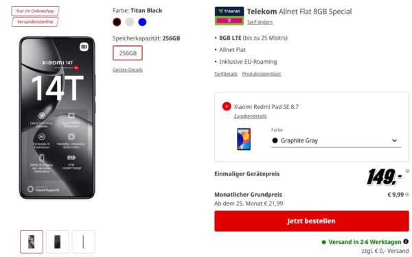Schönes Ding! Bei MediaMarkt bekommt ihr das Xiaomi 14T + Xiaomi Tablet + Xiaomi Staubsauger inkl. 8GB LTE + Telefon-Flat im Telekom-Netz für 9,99€/Monat