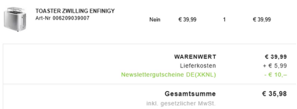 - Legt den ZWILLING Toaster in den Warenkorb und wendet den Code an.