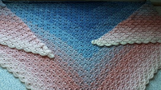 Schultertuch im Muschelmuster gehäkelt, in einem tollen Farbverlauf.