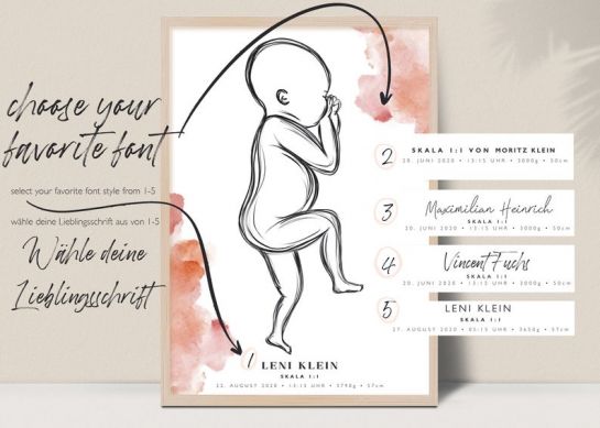 Handgefertigte im Maßstab 1:1 erstellte Geburtsposter mit Namen, Geburtsdatum Größe Gewicht etc. findest Du in vielen Designs auf: https://www.etsy.com/shop/mottiva?section_id=29853512