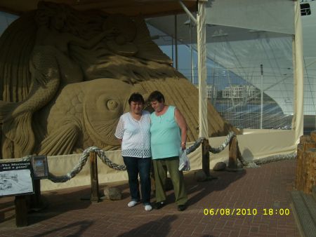 mit tinchen vor einer sandfigur in rostock