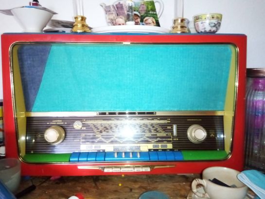 So Eines nur in nicht ganz so peppigen Farben hatte meine Oma. Sehr schön. Mit verstecktem Bluetoothadapter würde ich mir so was auch hinstellen.
