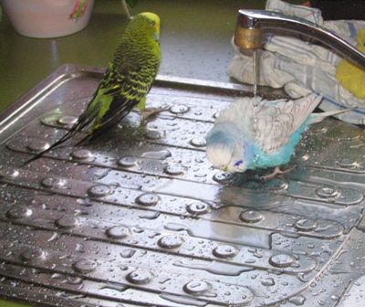 Wie putzig - baden in/auf der Küchenspüle - ein schönes Foto!
