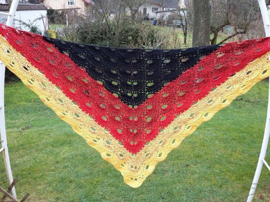 Schultertuch sehr groß. Fußballtuch in den Farben schwarz, rot, gold gehäkelt. Ein Muss für jeden Fan