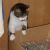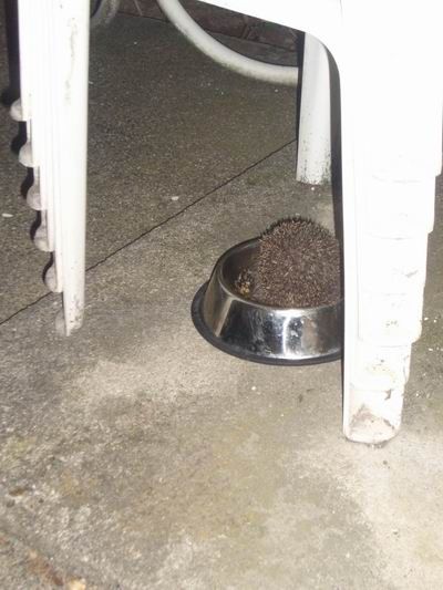 Unser " Mitesser". Ein kleiner Igel.Muss noch in die Futterschale krabbeln, um ans Katzenfutter zu gelangen.