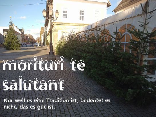 Latein lt Google übersetzt: es grüßen dich die Sterbenden,... Die Tannenbäume werden wie Schweine dazu gezüchtet.