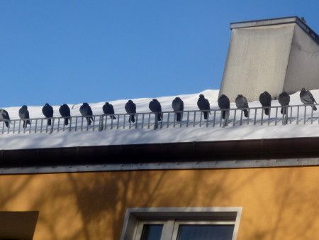 Stadttauben an einem Wintermorgen in einer Reihe