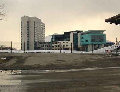 Die Veltins-Arena versteckt sich hinter dem Reha-Zentrum.