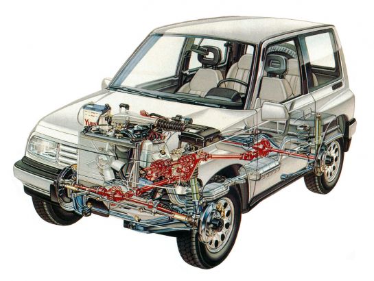 zu sehen auf jeden Fall ein "Allrad-Antrieb" (die roten Teile), für so ein kleines Fahrzeug ungewöhnlich