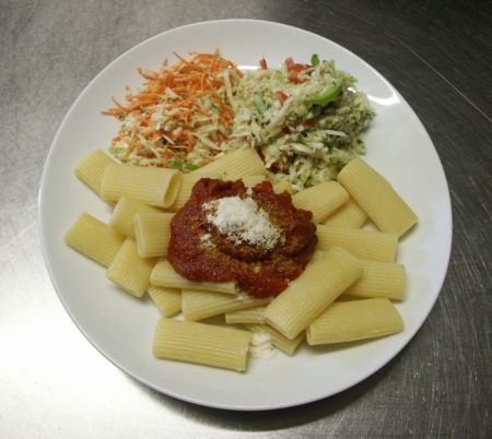 Rigatoni mit Tomaten- & Paprikacreme, frisch geriebenem Parmesan (18M), Weißkraut- & Hirtensalat